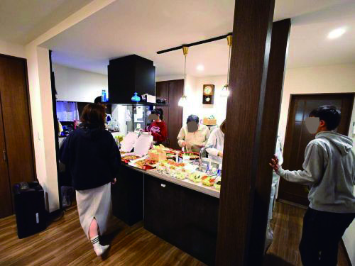 また手元も洗いものも丸見えで敬遠されがちなフラット対面キッチンですが、こちらでは広いカウンタートップを利用して、調理しながらお子さんの配膳を用意し、対面からお子さんが自分でテーブルまで運ぶそうです。