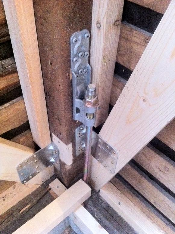 細い柱を補強したうえで、耐震金物で新しい基礎に固定