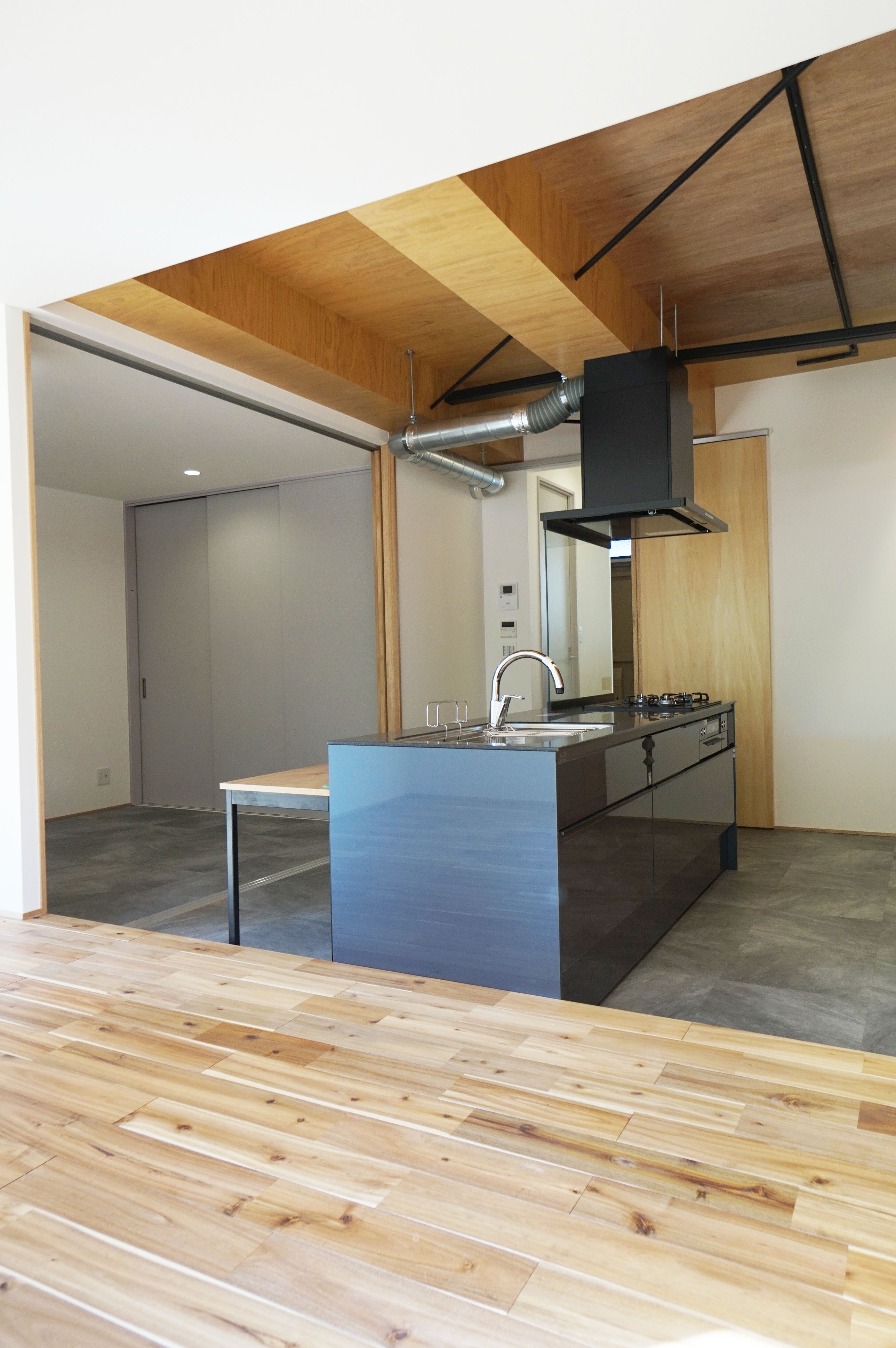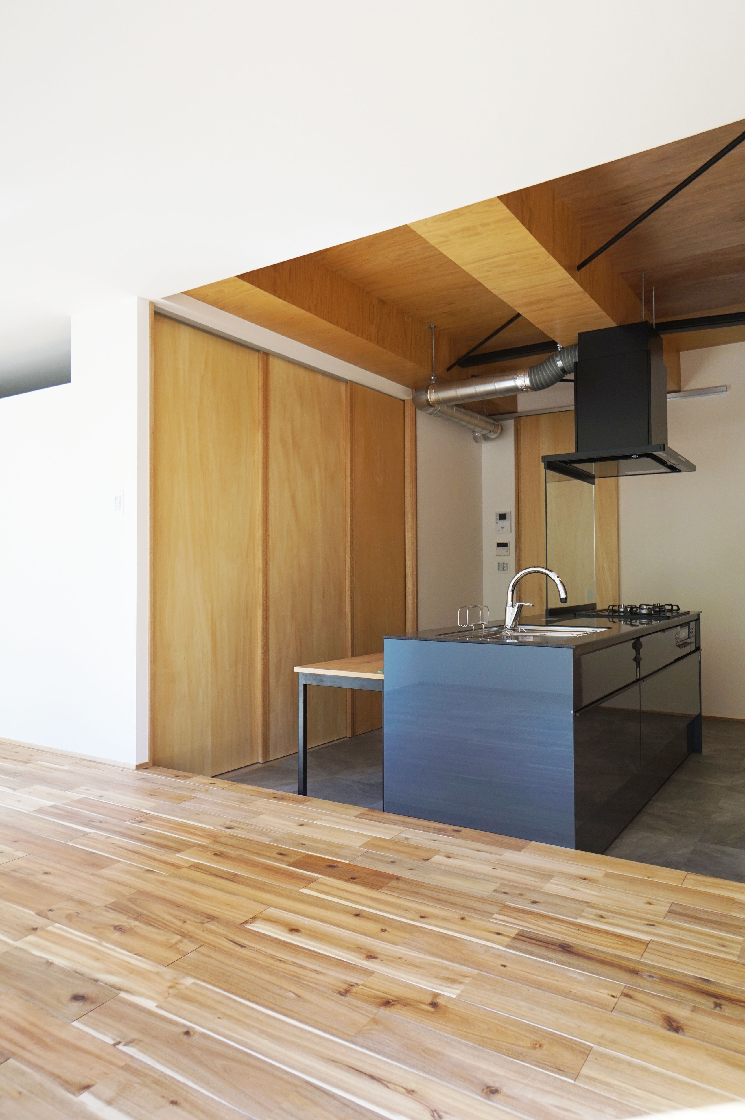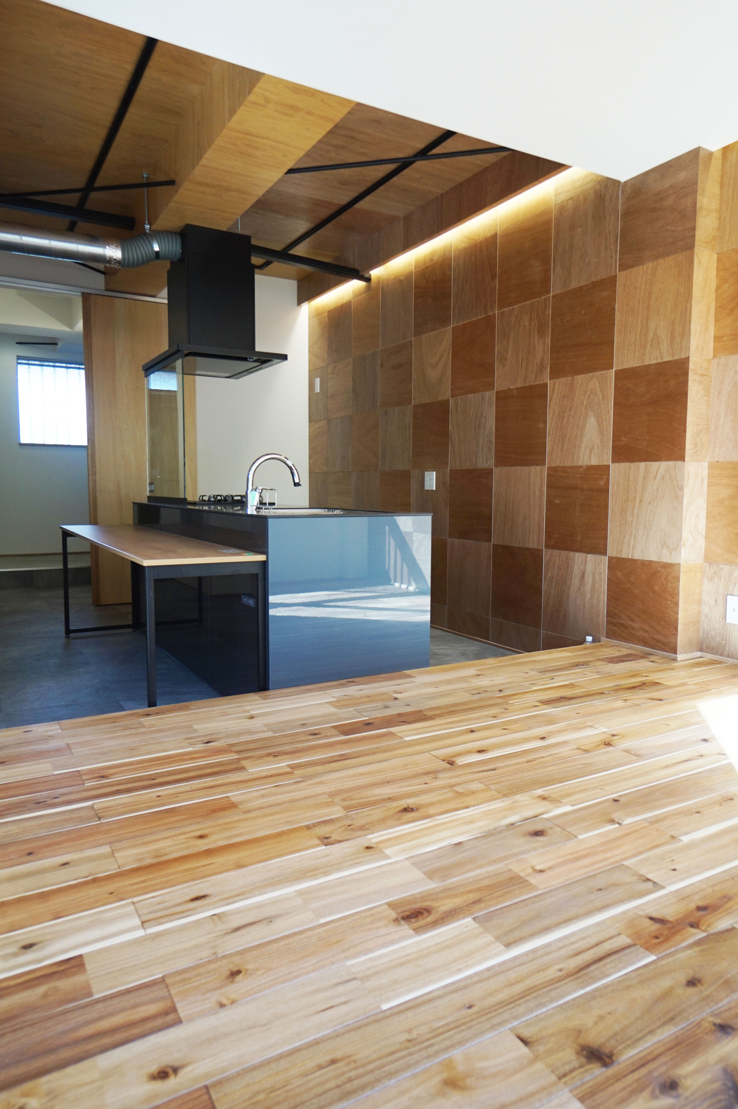 アカシア材の無垢床フロアの向こうは、シナ材の壁、天井はラワンランバー