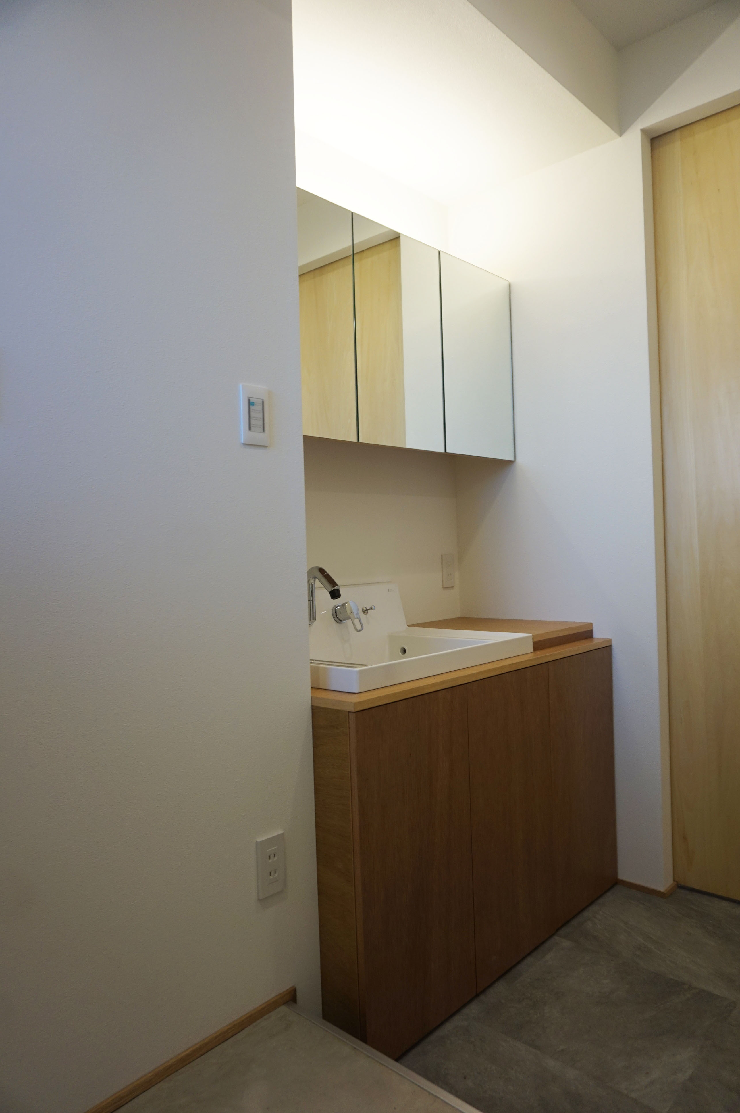 洗面台はラワン材で造作、洗面ボールはLIXILピアラボールを利用