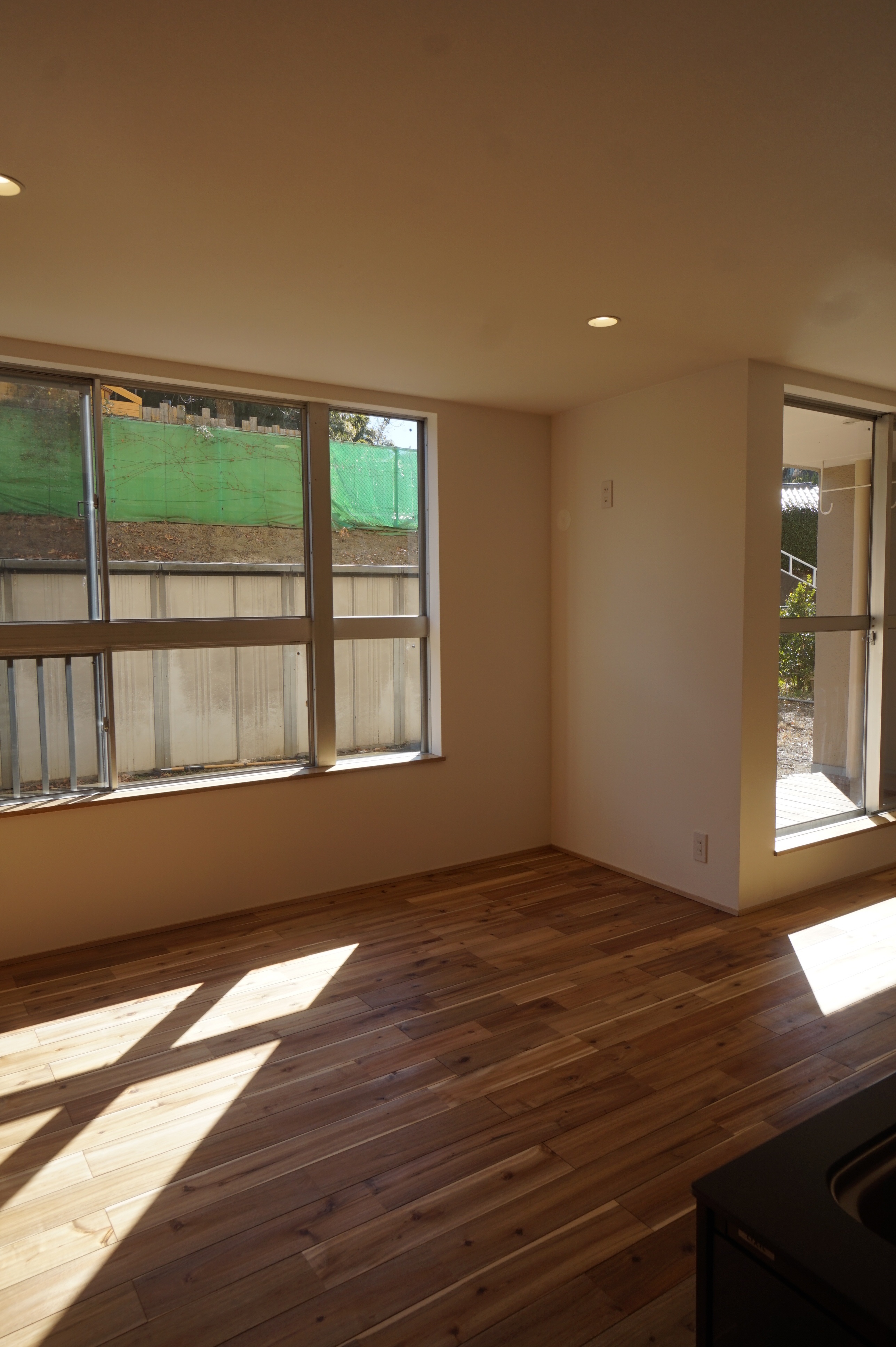 日当たり満点でお庭は自由に使えます。当初、青木製作の(もはや大工工事が予算オーバーだったため)ウッドデッキがドカンと鎮座していたのですが、マンション側からクレームが入り小さく削りました(とほほ)