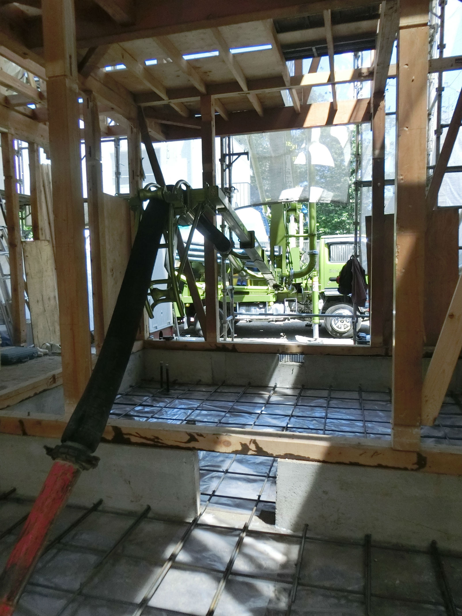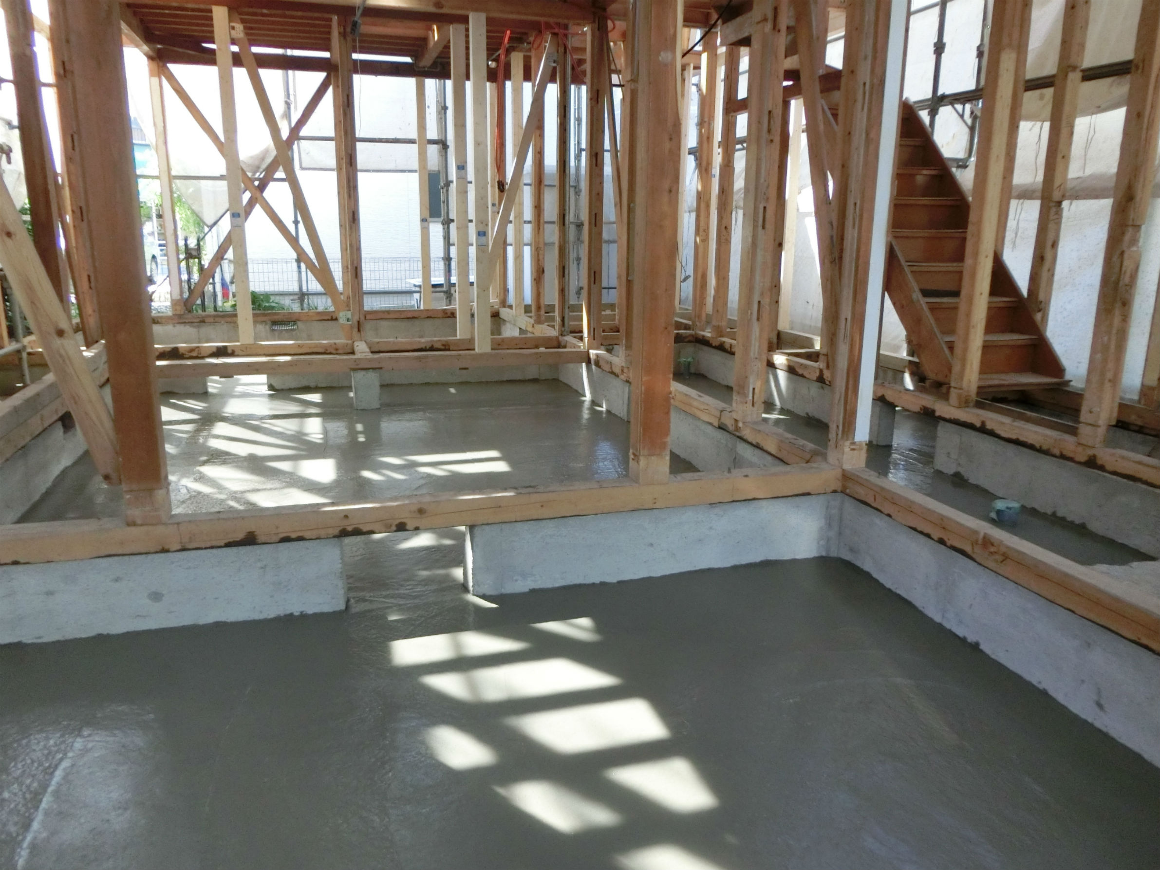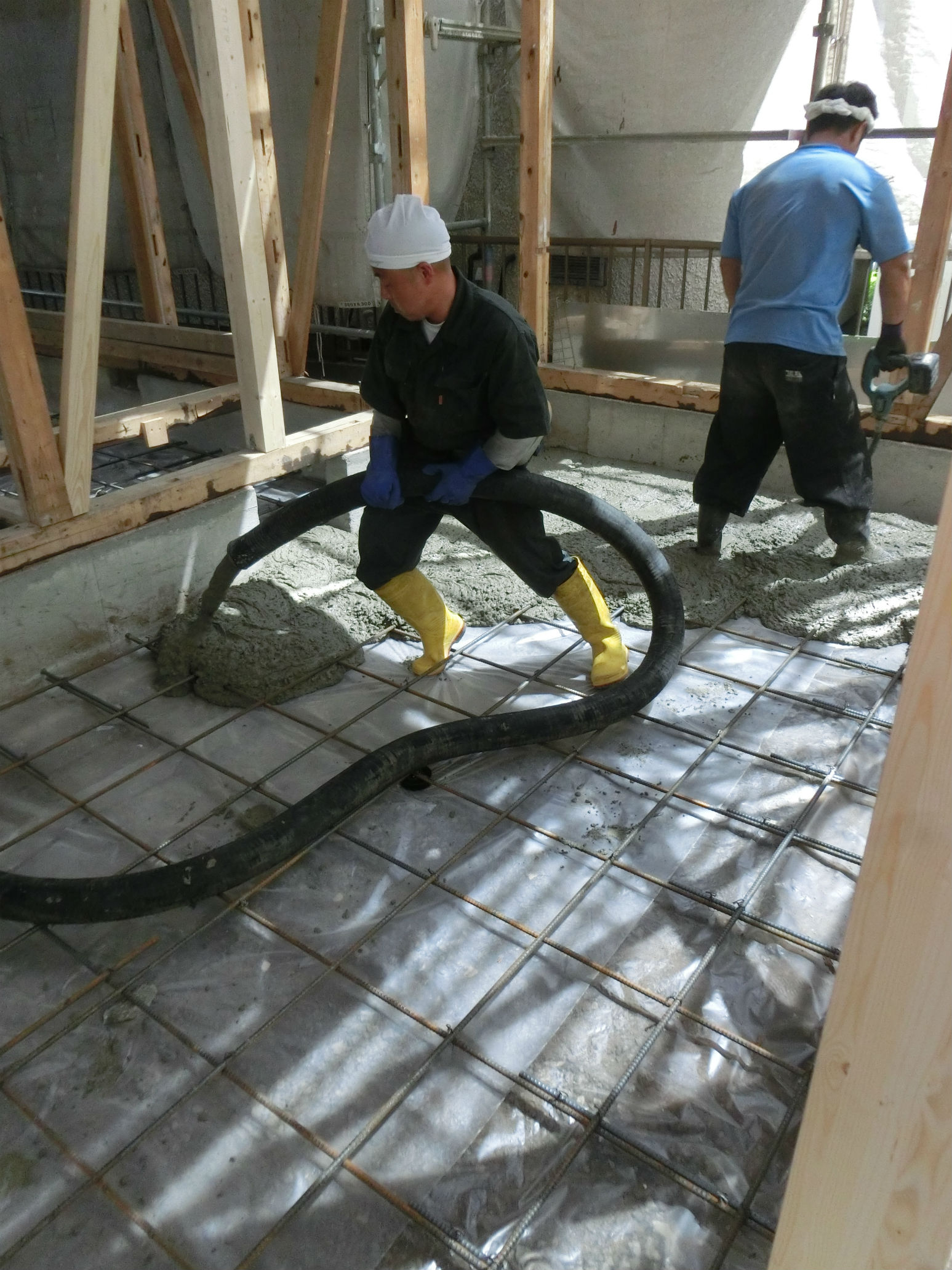 壁、傾斜天井には100㎜の高性能グラスウールをびっしりと入れ、床にはスタイロフォーム
