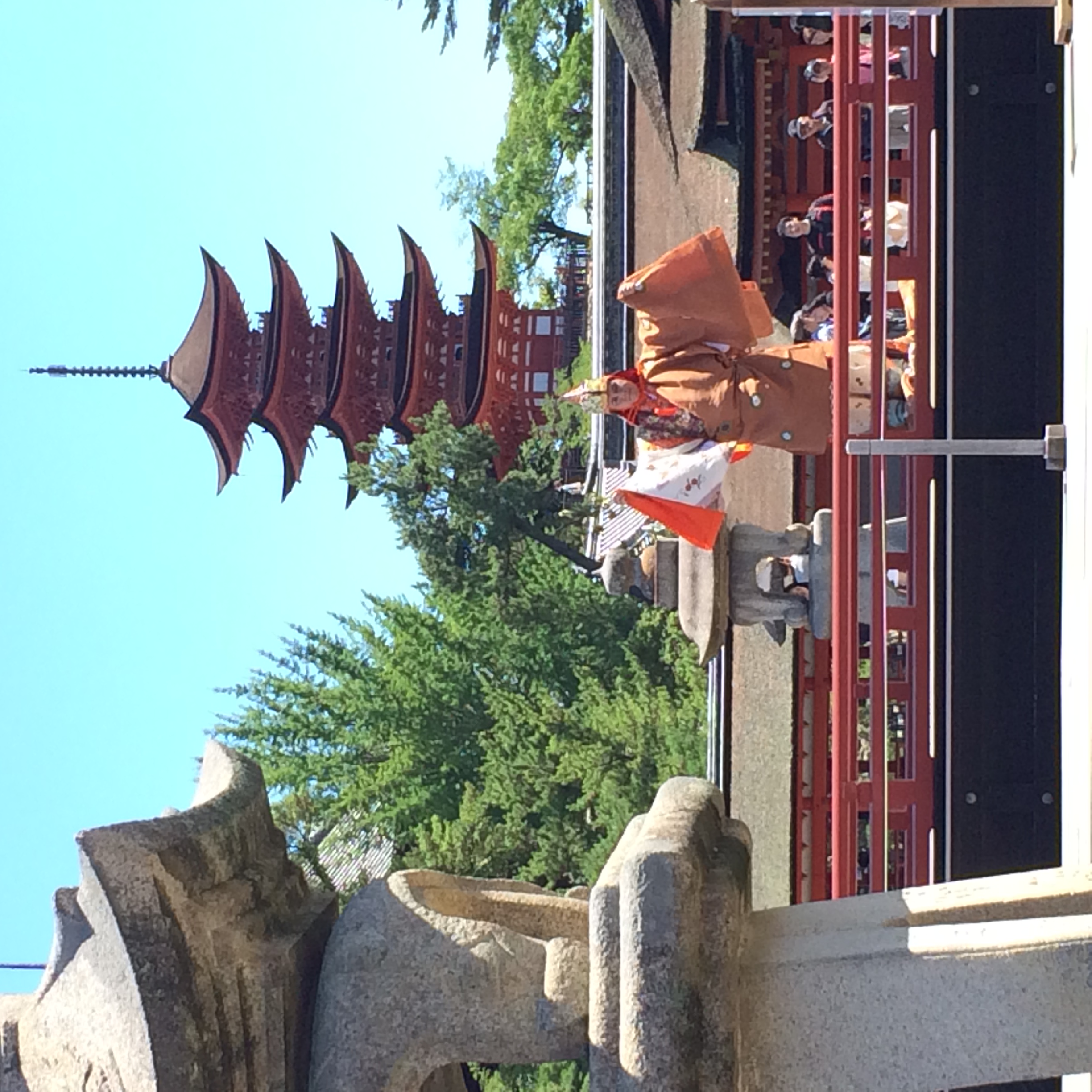 緑の山々を後ろに従え、緑に真っ赤な神殿が映え