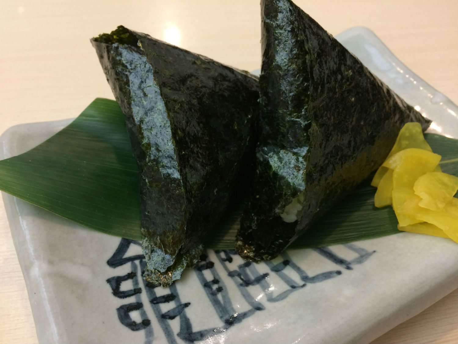 茶飯でむすんで、大判の海苔で包んであります