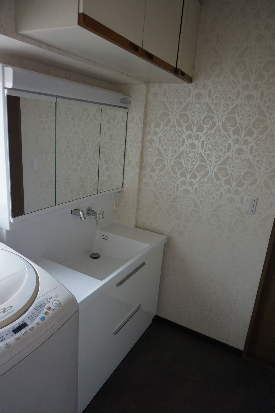 隣合う浴室と洗面室はベージュ&チョコレート色でカラーコーデ