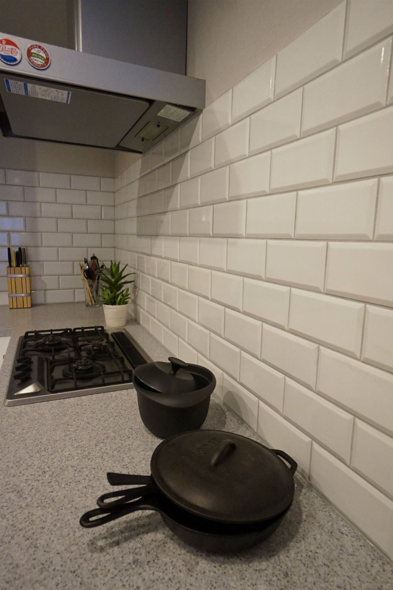 キッチン:フロアタイル 。。。 扉のない間口だけでつながる空間を