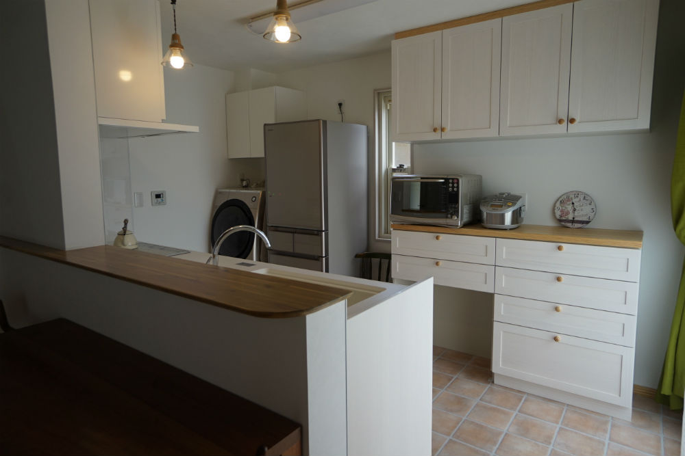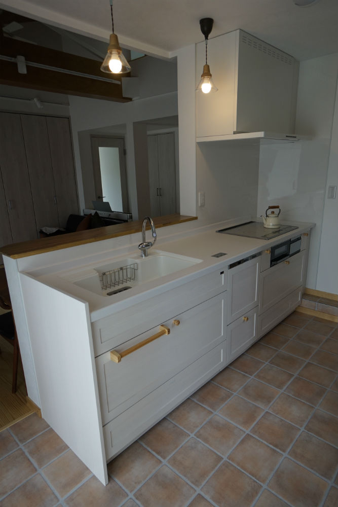 キッチンの雰囲気にあわせてテラコッタ調のフロアタイルも