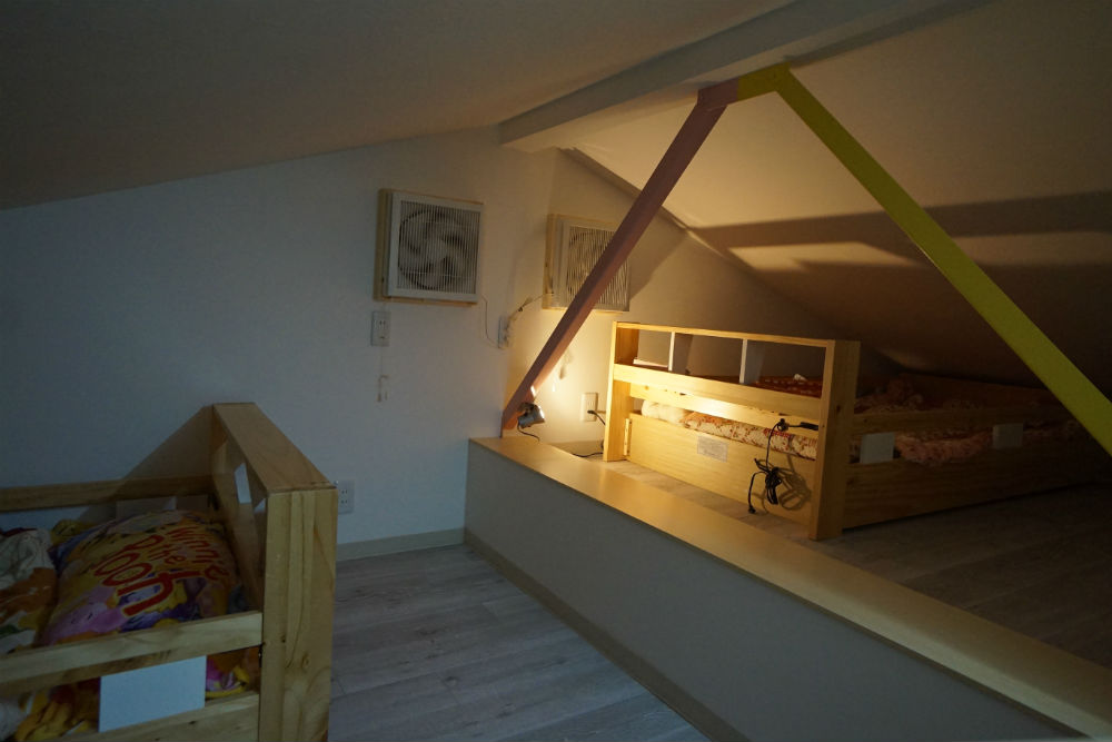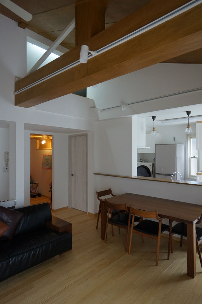 鉄骨の梁もベニヤ張りでナチュラルテイストなお部屋の雰囲気に合わせて