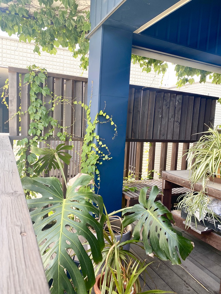 ところがこの春、どこから延びてきたのか隙間をかいくぐってツタがぐんぐん絡まって、ネイビーの外壁は緑に覆われ、いままで現れなかったバルコニーにまでやってきたのです。