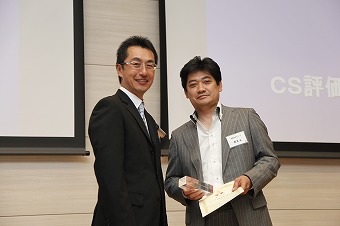 表彰式、壇上でのホームプロの社長様と弊社代表のアオキ。