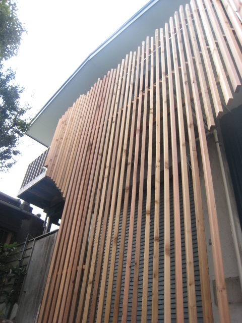| 最長6mの格子はレッドシダー | シッケンズ(保護剤)で仕上げ、 サイコロサインを付けて出来上がり! |