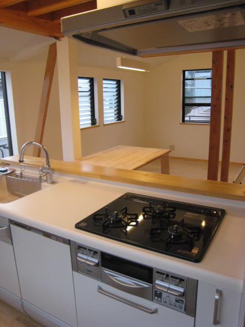 ・2階に上げたキッチンは、最新のキャビネットタイプのうえ、背面カウンターや元の押入れを