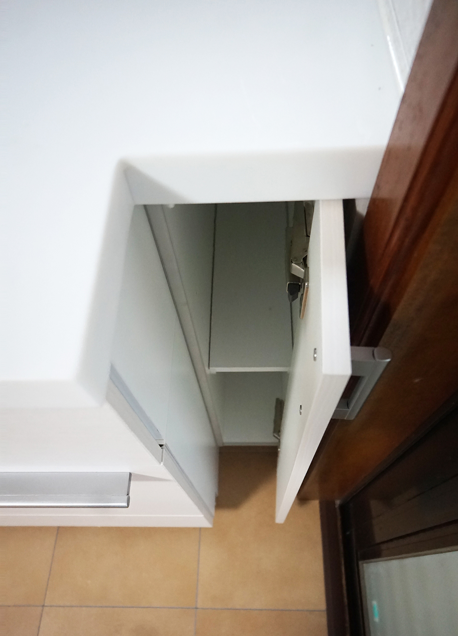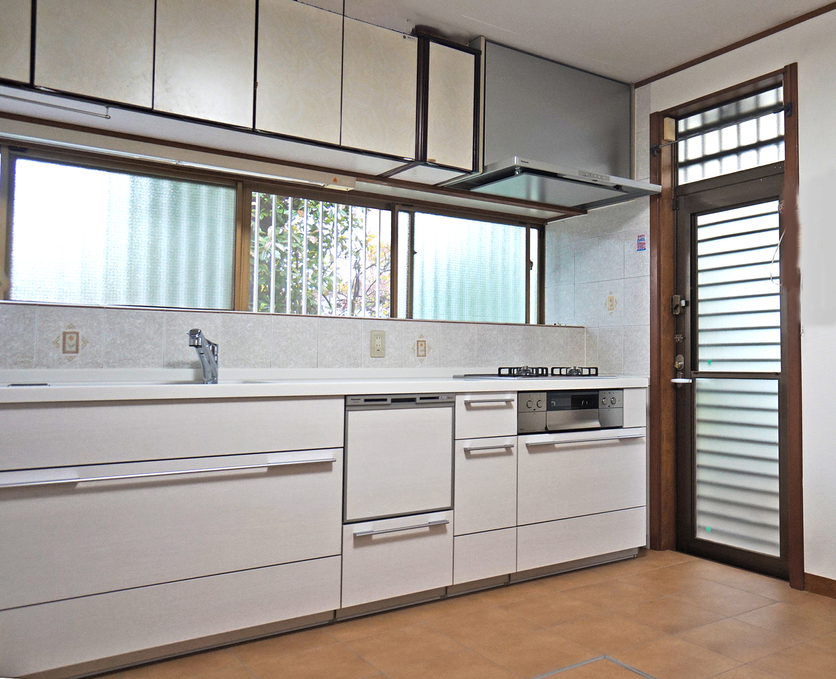 壁いっぱいの間口、勝手口ドア枠との干渉部分は